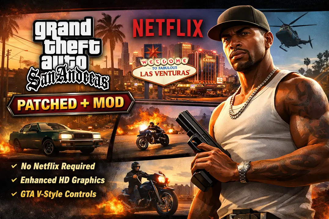 While the official Netflix edition requires an active subscription, this Patched + Mod version removes that limitation and adds essential fixes, allowing you to explore the entire state of San Andreas seamlessly with better stability and performance.