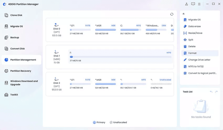For deeper disk or partition problems resulting in the USB detection issue, 4DDiG Partition Manager is a great solution. It can format, repair, clone, and manage drives, move your OS, and create bootable repair media.