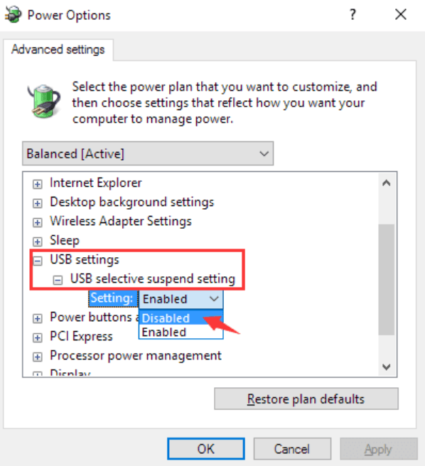In case you’re using a laptop to access a USB, you must know that laptops employ USB Selective Suspend. It’s a flash disk power-saving feature that puts idle USB ports to sleep. Sometimes this stops the computer from detecting a flash drive, leading to the ‘Windows Explorer USB device not recognized’ issue. You can deactivate this feature to help the computer find the drive right away. To do so: